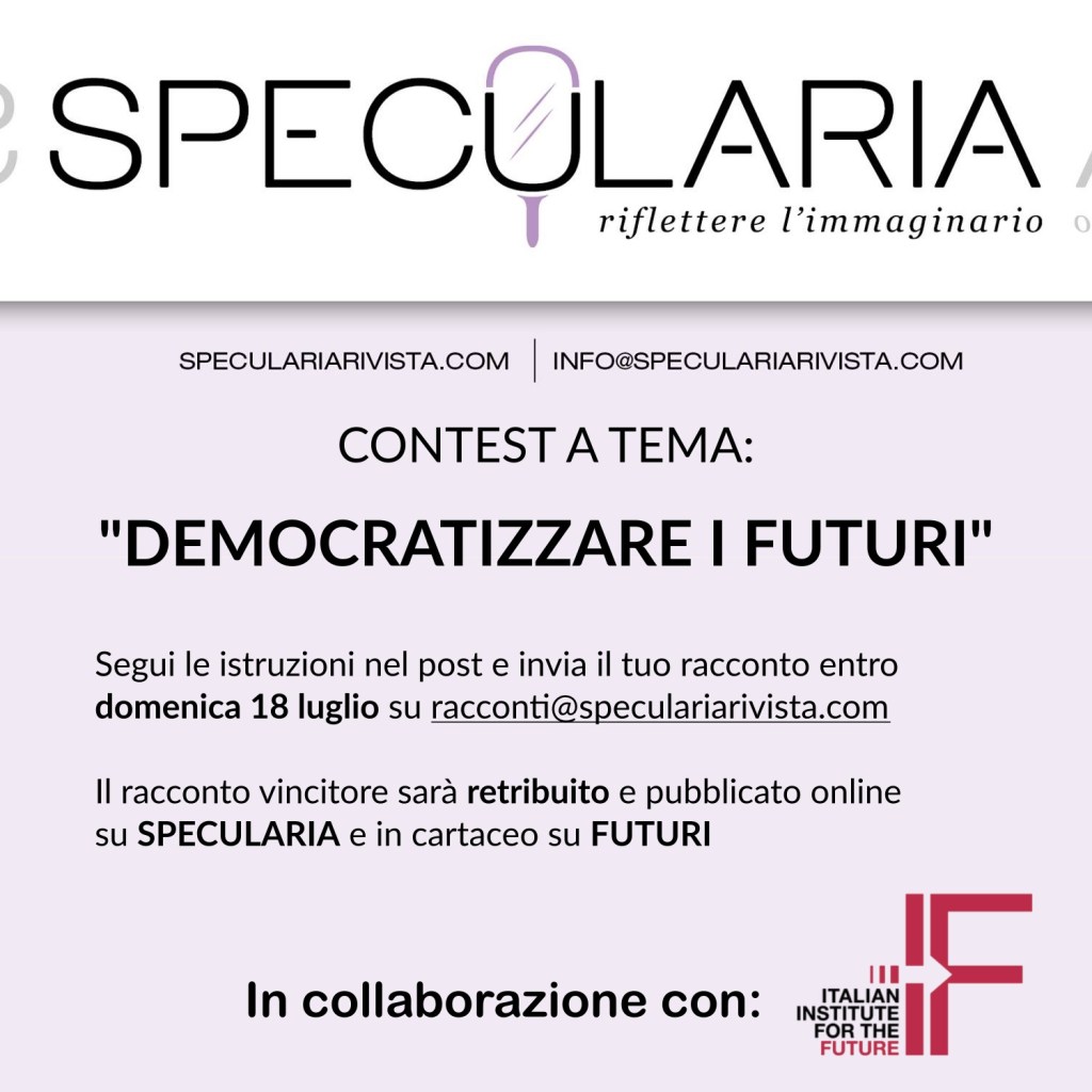 Il contest seguirà le stesse modalità del precedenti: chiediamo racconti che si sviluppano intorno all’idea di “democratizzare i futuri”. Ne sceglieremo uno solo, che avrà quindi una doppia pubblicazione (in digitale qui su SPECULARIA e in cartaceo su FUTURI, la rivista dell’IIF), oltre al solito compenso previsto dalla nostra policy per le submissions.