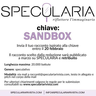 Per partecipare avete tempo fino al 20 febbraio, inviando il vostro racconto alla mail racconti[at]speculariarivista e indicando nell’oggetto “SANDBOX“. Il racconto scelto dalla redazione sarà pubblicato a marzo su SPECULARIA, in ogni caso ci riserviamo come sempre di considerare per la pubblicazione altri testi che ci appaiano meritevoli.