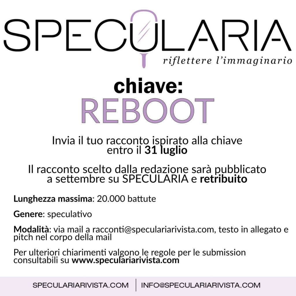 Per partecipare avete tempo fino al 31 luglio, inviando il vostro racconto alla mail racconti[at]speculariarivista e indicando nell’oggetto “REBOOT“. Il racconto scelto dalla redazione sarà pubblicato a settembre su SPECULARIA, in ogni caso ci riserviamo come sempre di considerare per la pubblicazione altri testi che ci appaiano meritevoli.